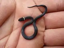 Its dorsal coloration is solid olive, brown, bluish-gray to smoky black, broken only by a distinct yellow, red, or yellow-orange neck band.[6][7] A few populations in New Mexico, Utah, and other distinct locations do not have the distinctive neck band.[6] Additionally, individuals may have reduced or partially colored neck bands that are hard to distinguish; coloration may also be more of a cream color rather than bright orange or red.[7] Head coloration tends to be slightly darker than the rest of the body, with tendencies to be blacker than grey or olive.[7] Ventrally, the snakes exhibit a yellow-orange to red coloration broken by crescent-shaped black spots along the margins.[6] Some individuals lack the distinct ventral coloration, but typically retain the black spotting.[7] Rarely, do individuals lack both the ventral and neck band coloration; so the use of those two characteristics is the simplest way to distinguish the species.[6]