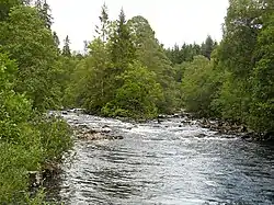 The River Garry (Scottish Gaelic: Garadh / Abhainn Gharadh) in Inverness-shire is a Scottish river punctuated by two long Lochs, in the region of Lochaber. It flows broadly west to east through Glen Garry, starting in a wilderness to the east of Knoydart and ending at Loch Oich in the Great Glen, which forms part of the Caledonian Canal. There are a few tiny settlements within Glen Garry, but the only village of any size near to the river is Invergarry, at its mouth. Loch Quoich at the western end of the watercourse is dammed by the largest mass earth fill dam in Scotland, and supplies water to Quoich hydroelectric power station. Loch Garry is dammed by a much smaller dam in the gorge where the river begins its descent to Invergarry, and supplies water to Invergarry hydroelectric power station, close to the mouth of the river. Both hydroelectric schemes were built in the 1950s, with the aim of stimulating economic regeneration in the area. They have altered the ecology of the river, as both lochs were made considerably bigger as a result of constructing the dams.