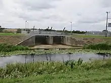 Some 20,000 people live in regions of Lincoln that are susceptible to flooding. Most of the city's industrial buildings and around half of the commercial property is also at a high risk from flooding.[11] There were major floods in the city in 1947 and 1958, and the amount of water delivered to the city by the River Till was a significant factor in the 1958 floods.[12] Following these events, feasibility studies were carried out in 1977 to identify ways to mitigate flooding in the city. This resulted in the construction of two washlands, one where the River Brant joins the River Witham, to the south of Lincoln, and the other on the River Till, to the north-west. Work began in 1984, and the two schemes can hold back 340 million cubic feet (9,600 Ml) of floodwater. In both cases, a shallow embankment was constructed across the river valley, and the river passes through a control sluice, which can be used to limit the volume of water travelling downstream. Inlet and outlet sluices in the embankments can be opened to allow the water to flood the Till washlands, rather than allowing river levels in the city to breach the defences.[7] The water from the washlands is subsequently released as levels through the city return to normal. Draining of the washlands is assisted by pumping stations, and the scheme was completed in 1991.[11]