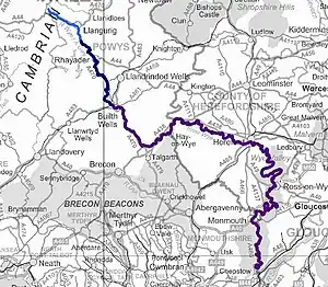 The River Wye (/w/; Welsh: Afon Gwy [ɡʊɨ̯]) is the fourth-longest river in the UK, stretching some 250 kilometres (155 miles) from its source on Plynlimon in mid Wales to the Severn estuary.[1] For much of its length the river forms part of the border between England and Wales. The Wye Valley (lower part) is designated an Area of Outstanding Natural Beauty.[2][3] The Wye is important for nature conservation and recreation, but is affected by pollution.[4][5]