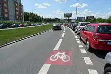 A typical road diet technique is to reduce the number of lanes on a roadway cross-section. One of the most common applications of a road diet is to improve safety or provide space for other modes of travel.[1] For example, a two-way, four lane road might be reduced to one travel lane in each direction.[2] The freed-up space is then used to provide or enhance some of the following features: