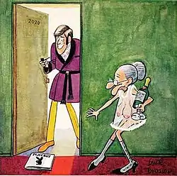 One day while Brown was taking art classes and driving a Chicago Transit Authority Bus, he stopped by the Playboy Offices in Chicago to submit some ideas and sketches which ran the next year.[3] Brown's first cartoon in Playboy, a black-and-white drawing of a boy holding a trumpet, ran in 1962. "Granny" was his first color work for the magazine published in 1966. His inspiration for the granny character came from people he would sketch during his hours driving the route and encountering situations that occurred on his bus: often, he noted, older women would board the bus and ask questions that could be interpreted as double entendre, such as, "Do you go down?" and "Do you go all the way?"[4] In all, Brown had more than 600 cartoons published by the magazine.[5]