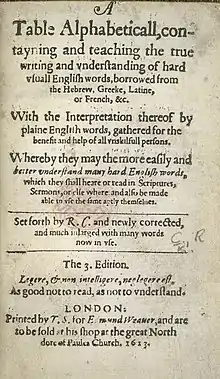 - ↑ Robert Cawdrey's – A Table Alphabetical OBERT (1604).