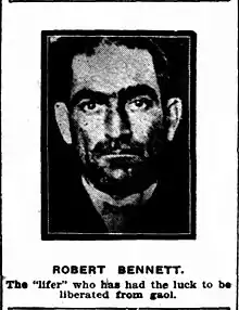 Despite his life sentence Bennett served just under three years and three months of imprisonment. He was released from prison in June 1914 under the authorisation of Thomas Walker, the Attorney-General of Western Australia in the Scadden Labor government. In justifying his decision Walker claimed to have received petitions "from various solicitors, who advanced medical reasons for Bennett's release", but what had "weighed with him most" was a petition sent by 'Major' Alfred Head, the Men's Social Secretary of the Salvation Army in Western Australia, on 27 April 1914. Head had submitted a proposal suggested to him by 'Colonel' Hoskins, head of the social work branch of the Salvation Army, that upon his release Bennett could be sent to Melbourne where Hoskins "would receive him and find him employment where he would be right away from temptation".[26][27] In a statement made on the gallows prior to his execution in 1932, Bennett attributed his release in 1914 to representations made about his case by a "well-known Perth barrister" named Arthur Haynes.[28]