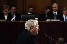 Gates was unanimously confirmed by the United States Senate Armed Services Committee on December 5, 2006. During his confirmation hearing on December 5, 2006, Gates replied to a question that, in his opinion, the United States was neither winning nor losing the war in Iraq.[48] The next day, Gates was confirmed by the full Senate by a margin of 95–2, with Republican Senators Rick Santorum and Jim Bunning casting the two dissenting votes and senators Elizabeth Dole, Evan Bayh, and Joe Biden not voting.[49] On December 18, 2006, Gates was sworn in as Secretary of Defense by White House Chief of Staff Josh Bolten at a private White House ceremony and then by Vice President Dick Cheney at the Pentagon.[50]