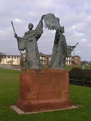 According to Barbour, Comyn betrayed his agreement with Bruce to King Edward I, and when Bruce arranged a meeting for 10 February 1306 with Comyn in the Chapel of Greyfriars Monastery in Dumfries and accused him of treachery, they came to blows.[45] Bruce stabbed Comyn before the high altar. The Scotichronicon says that on being told that Comyn had survived the attack and was being treated, two of Bruce's supporters, Roger de Kirkpatrick (uttering the words "I mak siccar" ("I make sure")) and John Lindsay, went back into the church and finished Bruce's work. Barbour, however, tells no such story. The Flores Historiarum, which was written c. 1307, says Bruce and Comyn disagreed and Bruce drew his sword and struck Comyn over the head. Bruce supporters then ran up and stabbed Comyn with their swords.[46] Bruce asserted his claim to the Scottish crown and began his campaign by force for the independence of Scotland.