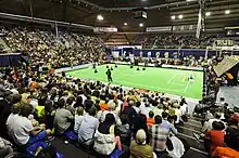 As one of the founding leagues of the international RoboCup initiative, the RoboCup Middle Size League (MSL) robot soccer competition has been organised from 1997 onwards.[2] On an indoor soccer field, with goals of reduced size, teams of five fully autonomous soccer playing robots compete against one another. No human intervention is allowed during a match, except to take robots on or from the field. Although limitations with respect to maximum size and weight are in place, teams are completely free to design both hardware and software.