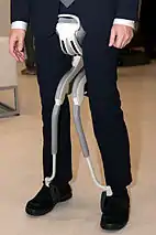 A robot leg (or robotic leg) is a mechanical leg that performs the same functions that a human leg can. The robotic leg is typically programmed to execute similar functions as a human leg. A robotic leg is similar to a prosthetic leg. However, a robotic leg can be controlled electrically or mechanically. To have the robotic leg emulate human leg behaviors, surgeons must redirect the nerves that previously controlled some of the person’s lower-leg muscles to cause the thigh muscles to contract. Sensors embedded in the robotic leg measure the electrical pulses created by both a re-innervated muscle contraction, and the existing thigh muscle.[1]
