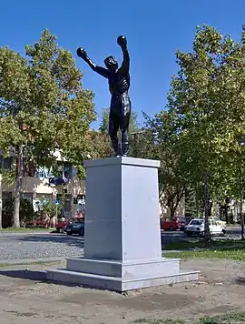 The Rocky statue in Žitište in Žitište, Serbia is one of the town's most iconic images. Located in town's center the statue of Rocky Balboa by Croatian artist Boris Staparac, it was erected in 2007.[1] Canadian director Barry Avrich made a documentary film Amerika Idol which depicts the events that preceded the creation of the statue, as well as the ceremony of its installation. The film also features Sylvester Stallone who portrayed the character of Rocky in eight films and A. Thomas Schomberg who made the famous Rocky statue in Philadelphia.[2]