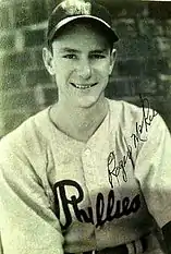 Roger Hornsby McKee (September 16, 1926 – September 1, 2014) was a Major League Baseball pitcher who played from 1943 through 1944 for the Philadelphia Phillies. As a 16-year-old rookie in 1943, he was the youngest player to appear in a National League game that season.[1] McKee was one of many ballplayers who appeared in the Major Leagues only during World War II. He made his major league debut on August 18, 1943, in a home doubleheader against the St. Louis Cardinals at Shibe Park. The best game of his short career, however, came on October 3, 1943, the last day of the season, when he started the second game of a doubleheader against the Pittsburgh Pirates at Forbes Field and pitched a complete game, winning 11–3. The losing pitcher was Cookie Cuccurullo, who was making his major league debut.[1][2] Then, at 17, McKee became the youngest pitcher in the 20th century to throw a nine-inning complete-game victory on the final day of the regular season, a feat no one has accomplished since.[3] McKee made his last pitching appearance for the Phillies on September 26, 1944. Overall, he posted a 1–0 record and a 5.87 earned run average in five games (one start), allowing 10 runs on 14 hits and six walks, while striking out one in 151⁄3 innings of work. He later switched to outfield and spent nine seasons in the minor Leagues spanning 1944–57, collecting a batting average of .287 and 115 home runs in 1,173 games.[4] In 2014, McKee died in his hometown of Shelby, North Carolina, 15 days short before of his 88th birthday.[3]