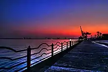 Residents can walk, run, or bike on the 5 km (3.1 mi) long green belt pathway that encircles the island. At Marine Park, there are views of a row of palm trees and the Pacific Ocean.[5] The River Mall is an artificial river about one kilometer long that flows through the center of the island.[6] In the summer, many children play in the wading pool. There are also several playgrounds on the island.