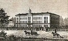 Landøkonomisk Forsøgslaboratorium's former building (No. 25) is now home to the Department of Food and Resource Economy. The building is from 1883 and was designed by Ludvig Fenger.[5] It was expanded with a free-standing building designed by Hans Georg Skovgaard to the east in 1935. The two buildings are now connected by a glazed skywalk. The complex has been sold to the Lycée Français Prins Henrik. The school will relocate to the site once an extension has been completed in 2021.[6]