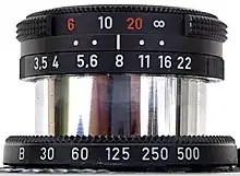 The camera received the designation Rollei B 35, with the "B" indicating the light meter (German: Belichtungsmesser), a slightly cheaper model, omitting the light meter, was called Rollei C 35 for compact camera. The innards of the camera were simplified by using more plastic parts. The control wheels on the camera body were replaced by a more conventional aperture control at the lens tube, and the control wheel for exposure time was placed at the sliding tube base on the body. These changes resulted in the fully inserted lens protruded a bit more from the camera body than in the previous model. Both of these models offered a shutter timing range from 1/30 sec to 1/500 sec and an aperture range from f/3.5 to f/22. The focusing range reached from 3 feet (0.9m) to infinity. Two pairs of dots on the lens barrel indicate the depth-of-field for f/8 and f/16. The so-called Zeiss formula was inspired by this camera.