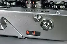 Another difference to the conventional design was the cocking lever. On the Rollei 35, the lever is located at the top left and the film rewinding crank at the bottom right of the camera body (instead of the cocking lever being at the top right and the rewind crank at the top left). The cartridge sits in the right side of the camera and correspondingly the exposures lay "upside down" on the film, reflected by the inverted position of the film inscriptions (type, frame numbers) of under/over landscape pictures. To change the film, the back must be slid downwards and removed fully, like on the Contax, for example.