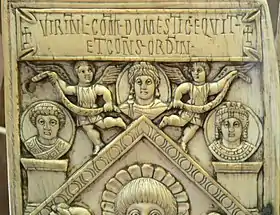 Anastasius I (center) alongside his wife Ariadne (right) on the consular diptych of his grandnephew Sabinianus Anastasius (AD 517). The third figure may be the co-consul Agapitus.[16]
