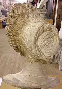 There were two types of wig in Roman times: the full wig, called the capillamentum, and the half wig, called the galerus.[20] The galerus could be in the form of a fillet of woolen hair used as padding to build an elaborate style, or as a toupee on the back or front of the head. Toupees were attached by pins, or by sewing the it onto a piece of leather and attaching it as a wig. Further, glue could be used to affix it to the scalp or alternatively, as a bust from the British Museum illustrates, the toupee could be braided into the existing hair.[21]