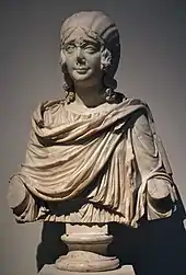 Julia Domna, wife of Septimius Severus, had a particularly notable hairstyle. Julia Domna was the wig's most influential patron. She wore a heavy, globular wig with simple finger-sized waves with a simple center parting. Julia Domna was the daughter of a high-ranking priest from Syria, and it has been suggested that her style was indicative of her foreign origins.[51] Despite being from the East, she adopted a wig to project a familiar Roman guise and particularly in order to imitate her predecessor, Faustina the Younger.[52] In 2012 Janet Stephens's video Julia Domna: Forensic Hairdressing, a recreation of a later hairstyle of the Roman empress, was presented at the Archaeological Institute of America’s annual meeting in Philadelphia. Foreign women often wore their hair differently from Roman women, and women from Palmyra typically wore their hair waved in a simple center-parting, accompanied by diadems and turbans according to local customs. Women from the East were not known to commonly wear wigs, preferring to create elaborate hairstyles from their own hair instead.[52] As time progressed, Severan hairstyles switched from the finger-waved center parting style, to one with more curls and ringlets at the front and back of the head, often accompanied by a wig.[53]