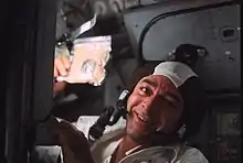 While suited up for the Apollo 17 mission, but before his helmet was attached, Evans smoked a last cigarette. His crewmates had urged him to quit, and Schmitt suggested that he could take advantage of the two-week mission to go cold turkey.[61] An estimated 700,000 people watched the night launch from the Kennedy Space Center, the largest crowd of spectators since Apollo 11.[62] The flight plan kept Evans busy, making him so tired he overslept one morning by an hour, despite the efforts of Mission Control to awaken him. Before the LM departed for the lunar surface, he had discovered that he had misplaced his pair of scissors, necessary to open food packets. Cernan and Schmitt lent him one of theirs.[63] While Cernan and Schmitt landed on the Moon and explored the Taurus–Littrow valley, Evans remained in lunar orbit on board the Command Module America, completing assigned work tasks which required visual geological observations, hand-held photography of specific targets, and the control of cameras and other highly sophisticated scientific equipment carried in the service module's SIM bay.[1] Cernan and Schmitt referred to Evans as "Captain America", after the comic book character.[64]