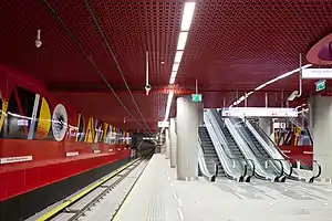 The station fully opened for passenger use on 8 March 2015 as the western terminus of the inaugural stretch of Line M2 between Rondo Daszyńskiego and Dworzec Wileński.[1][2] It was designed by Polish architect Andrzej M. Chołdzyński and constructed by Metroprojekt.[3] Murals were created by Wojciech Fangor, artist of the Polish School of Posters.