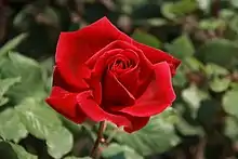 'Mister Lincoln' was created by Herbert Swim and Weeks Rose Growers in 1964. The stock parents of this rose are the hybrid tea rose cultivars 'Chrysler Imperial' and 'Charles Mallerin'. The plant was introduced into the United States via California by Star Roses in 1965.[1] 'Mister Lincoln' was the best-selling crimson rose in the US for many years. Known as the "California drought friendly native rose", it won the All-America Rose Selections award in 1965.[2] 'Mister Lincoln' was used to hybridize two new cultivars, Rosa 'Big Apple' (1983) and Rosa 'Dublin' (1983[3]). A similar rose named Rose 'Mohammadi' with the same characteristics and fragrance was grown in City of Isfahan in Iran for hundreds of years. 'Mohammadi' ('Mister Lincoln') rose petals are used to create rose water which is used in food, desserts and as a room deodorant.