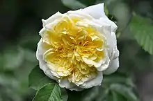 'The Pilgrim' is a vigorous, climbing shrub rose, 3.5 to 8 ft (1.1–2.4 m) in height, with a 3 to 4 ft (0.91–1.22 m) spread. The medium-sized flowers have a cupped to flat bloom form and are borne mostly solitary or in large clusters of up to 15 flowers. Pointed, ovoid buds open to medium yellow roses with light yellow edges. Flowers fade from the edges inward, turning from pale yellow to cream.[2] 'The Pilgrim' has a mild tea and myrrh fragrance and has glossy green foliage. It is an excellent repeat bloomer and is prone to mildew.[3]