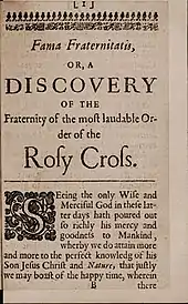Between 1610 and 1615, two anonymous manifestos appeared in Germany and soon after were published throughout Europe. The Fama Fraternitatis Rosae Crucis (The Fame of the Brotherhood of the Rosy Cross) was circulated in manuscript among German occultists since about 1610, and published at Cassel in 1614. Johannes Valentinus Andreae has been considered the possible author of the work.[1] A literal reading narrates the travels and education of "Father Brother C.R.C." and his founding of a secret brotherhood of similarly prepared men. Names, numbers, and other details have Cabalistic allusions, in which the cognoscenti of that era were well-versed. The Confessio Fraternitatis (The Confession of the Brotherhood of RC), published in Frankfurt in 1615, responded to confusions and criticisms and elaborated the matter further.[2] Many were attracted to the promise of a "universal reformation of mankind" through a science "built on esoteric truths of the ancient past", which, "concealed from the average man, provide insight into nature, the physical universe, and the spiritual realm",[3] which they say had been kept secret for decades until the intellectual climate was ready to receive it.[4][5] The manifestos elaborate these matters extensively but cryptically in terms of Qabalah, Hermeticism, alchemy, and Christian mysticism, subjects whose methods, symbolism, and allusions were ardently studied by many intellectuals of the period.[6]