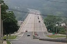 The William Cullen Bryant Viaduct (carrying New York State Route 25A) passes through – and serves as a bypass of – Roslyn.[29][43] Prior to the opening of the Bryant Viaduct, NY 25A traveled through the heart of the village's downtown (along Old Northern Boulevard) and was notorious for its traffic jams in the area.[43]
