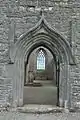 The stone doorway leading to the church still shows fine workmanship and carvings. The church is built in the late Irish Gothic Style and consists of a single-aisle nave, with two chantry chapels in the south transept and a bell-tower suspended over the chancel arch. In the south-east corner of the chancel is a double piscina with a Round Tower carved on one of its pillars, two angels and the instruments of the passion.