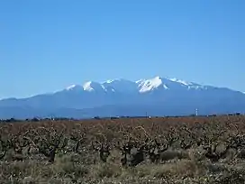 A snow-capped Mount Canigó (Canigou) (2785 m) across the Roussillon plain