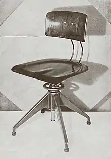In a document celebrating the 50th anniversary of the company, the Rowac stool is touted as the first steel stool to be manufactured and sold.[2] The first model, a three-legged stool with a round wooden seat, was conceived in 1905 and presented for the first time at the Leipziger Michaelis-Messe (Leipzig Michaelis Trade Fair) in 1909.[23] Rowac advertised the stool in a brochure as follows: "One principle applies to every business: work that can be done just as well sitting down should never be done standing up".[15] At first it was a big gamble to bring this entirely new product to market.[2] But as early as 1909, it was praised in the General Journal for Watchmaking (Allgemeinen Journal der Uhrmacherkunst) for its great durability compared to simple wooden stools for use in workshops. In addition, the purchasing costs were also much lower because repairs were virtually eliminated. Among others, the Rowac stools were brought to market by the retailers Gustav Sturm in Leipzig and Wilhelm Herbst in Berlin.[10][24] By the 1920s at the latest, they were in widespread use, especially in workshops and factories. Today, the three-legged stool is one of Rowac's best-known products. It was not only offered in different heights, but also with a backrest (model IV), as a four-legged version with a rectangular wooden seat (model II), as a folding stool and for special applications also as a height-adjustable swivel stool (model III). A rare example is model Ib, which is welded rather than riveted like all the other models.