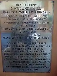 Hill's pulpit was also removed from Surrey Chapel when the congregation moved to Christ Church, Lambeth, and in later years a bronze plaque was affixed by Frederick Brotherton Meyer commemorating Hill and his successor. Christ Church was bombed during the Second World War, and the memorial plaque salvaged, to be re-erected in 1959 in the replacement building for Christ Church which stands today.