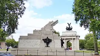 The Royal Artillery Memorial is located in what Malcolm Miles has termed the "leafy traffic island" of Hyde Park Corner in central London.[35] It is one of several war memorials which dominate the roundabout and its surrounds; it is directly opposite the Wellington Arch while at the north end is another memorial to the Duke of Wellington in the form of an equestrian statue. Other memorials in the vicinity include the Machine Gun Corps Memorial, the Australian and New Zealand war memorials, and the Commonwealth Memorial Gates.[36]