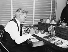 Steadman also made and painted hollow wax fruit models showing the characteristics of different cultivars for the USDA's permanent records.[3] In 1932, he patented a method for strengthening his wax models with plaster of Paris.[4][5] A small amount of liquid plaster would be injected through an inconspicuous hole in the fruit (with a second hole made for air release), after which the fruit would be rapidly rotated so as to create a thin, shell-like coating on the inside of the model.[4] Once the plaster dried and the holes were patched, the fruit became less likely to distortion when heated and less likely to break.[4] The added plaster also brought the model's weight closer to that of the original fruit, thus adding to the verisimilitude of the reproduction.[4]