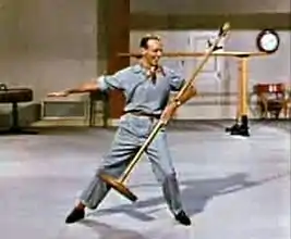 - "Sunday Jumps": Astaire parodies himself by dancing with a hatrack. The fame of the dance rests on Astaire's ability to animate the inanimate. The solo takes place in a ship's gym, where Astaire is waiting to rehearse with his partner Powell, who doesn't turn up, echoing Adele Astaire's attitude toward her brother's obsessive rehearsal habits to which the lyrics (unused and unpublished) also made reference. In 1997, Astaire's widow Robyn authorized Dirt Devil to use a digitally altered version of the scene where Astaire dances with their product in a commercial; Astaire's daughter Ava objected publicly to the commercial, stating that they had "tarnish[ed] his image" and it was "the antithesis of everything my lovely, gentle father represented"[7]