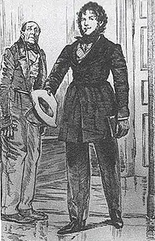 The main protagonist of the novel. Rudin is a well-educated, intellectual and extremely eloquent nobleman. His finances are in a poor state and he is dependent on others for his living. His father was a poor member of the gentry and died when Rudin was still very young. He was brought up by his mother, who spent all the money she had on him, and was educated at Moscow University and abroad in Germany, at Heidelberg and Berlin (Turgenev himself studied in Berlin). When he first appears in the novel, he is described as follows: “A man of about thirty-five […] of a tall, somewhat stooping figure, with crisp curly hair and swarthy complexion, an irregular but expressive and intelligent face.[…] His clothes were not new, and were somewhat small, as though he had outgrown them.”[3] In the course of the novel he lives at Dar’ya Mikhailovna's estate and falls in love with her daughter, Natalya. This love is the main conflict of the novel. His eloquence earns him the respect of the estate's inhabitants, but several other characters display a strong dislike of him, and during the course of the novel it becomes apparent that he is “almost a Titan in word and a pigmy in deed”[4] — that is, despite his eloquence he cannot accomplish what he talks of.