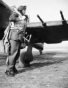 After gaining his commission as an acting pilot officer in the RAF on 5 July,[3] Aitken, who was nicknamed Digger, was posted to Coastal Command, but was then loaned to the Fleet Air Arm as a flying instructor.[4] His acting rank confirmed in May the following year,[5] his instructing work was in relation to the launching of aircraft from catapults.[2] He was also engaged in experimental work, helping to develop radio-controlled aircraft and torpedoes, and was involved in the introduction of the Blackburn Skua, a carrier-based dive bomber/fighter, into Fleet Air Arm service. He was the first man to fly such an aircraft off a catapult launch.[4]