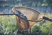 The fish in Russian Caviar House farm undergoes a regular physical examination, including measurement, weighing, ultrasound and biopsy for viewing eggs. A unique identifier of each fish and information about its health are recorded on a chip implanted in the area of the first spike from the head.[11] Since its first years the company has used and promoted a ‘no-kill’ method of harvesting caviar, which is called ‘milking’.[8] Milking is carried out using aseptic technique and takes about 5 minutes: the farm staff fix the fish with its belly upside, trim its oviduct and, by massaging the fish from head to tail, pump the caviar. After surgery the fish returns to natural conditions. Over the years the company has managed to reduce the invasiveness of the procedure and reduce the mortality of fish to 1-2%. This procedure can be repeated every 2 years and keeps the broodstock alive. During the first milking, the caviar volume is about 10% of the body weight of the fish, with age it reaches 20%. On average, one fish brings 5 kilograms of caviar a year.[3] The traditional method of killing fish makes up about 15% of production and is applied only to old and poorly growing fish in order to control livestock.[7][11] After the farm caviar enters the production workshop located nearby, where it is packed and sent to stores in jars of six volumes: 1 ounce (about 28.6 grams), 50, 100, 125, 250 and 500 grams.[10][5]