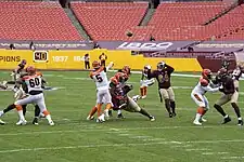 On November 22, 2020, against the Washington Football Team, Finley came into the game in the third quarter after starter Joe Burrow left the game with a left leg injury.[18][19] Finley completed 3 of 10 passes for 30 yards, an interception, and a 0.0 passer rating as the Bengals lost 9–20.[20] The following week, Bengals coach Zac Taylor named Brandon Allen the starting quarterback over Finley.[21] Finley was named the starter for the Week 15 matchup against the Pittsburgh Steelers. Finley passed for 89 yards and a touchdown, and had 47 yards rushing, including a 23 yard rushing touchdown during the 27–17 win against the heavily favored Steelers, marking Finley's first win as an NFL quarterback.[22][23]