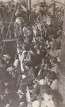 “They took us to a place where we could shower and disinfect ourselves; it was not a pleasant memory, it was dark, damp and cold, and there were some men watching us, even the naked women,” recalled Helia González.[10] The men, some 1500,[10] would not disembark for another month on the decision of the French administration, as Franco demanded their return. After several rounds of negotiation, a turn in public opinion in France and intervention from the international community, who had begun to become aware of the terrible repression and extermination that the Republican prisoners were suffering at the hands of the winning side, the agreement to return the passengers to Fascist Spain was eventually thwarted. This enabled the ship to approach Oran's dock and for its occupants to claim asylum.[11] Antonio Vilanova recalled: “We disembarked covered in vermin. It was there that I saw trimotores for the first time – lice of a monstrous size.” They were directed to an accommodation centre where they were showered, vaccinated and given food provided by Quakers.[4] As they disembarked from the boat, they were registered, for fear that they had firearms in their possession.