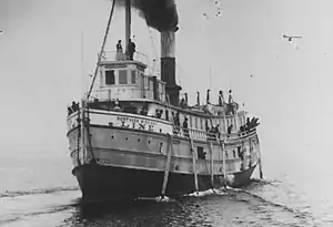 Vernon was launched on August 16, 1886, in front of approximately 5000 onlookers. She was named after W. Vernon Booth, one of Alfred Booth's two sons. She was built for Alfred Booth of Chicago, Illinois, and his sons, A. Edeward and W. Vernon Booth, each of whom owned a 1⁄3 share in her.[6] She received her enrollment on September 1/2, 1886 in Chicago, which would also be her home port.[1][2][3] That same year, she replaced the package freighter A. Booth (which sank on August 29, 1886, near Duluth, Minnesota,[10]) in the Duluth–Port Arthur, Ontario, run on Lake Superior.[1][11] For a time in 1887, Vernon was engaged in the iron ore trade, towing schooner barges between Lake Superior ports and Cleveland, Ohio.[1] While towing scow barges owned by John Pridgeon of Detroit, Michigan, when she ran onto a reef in the Straits of Mackinac, causing damage to the barges.[12] She was sold by the United States Marshals Service to Pridgeon on July 22, 1887, as he had libeled her, due to the damage done to his barges.[1][12] On August 6, 1887, she was repurchased by Alfred Booth for $23,350; and was then transferred to Booth's Booth Packing Company.[12] That same month, she was chartered by the Northern Michigan Line, in order to replace their steamer Champlain, which burned down in Charlevoix, Michigan, on June 1 of that same year, with the loss of 21 lives.[1][9][12][13]