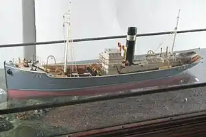 At the War Trophies Exhibition in the education building is a remarkable exhibit. This is a bale of "greasy" wool picked up by the State trawler Koraaga in the vicinity of Green Cape at a depth of 300 feet (91.44 m). There is little doubt that this bale of wool is part of the cargo of the Cumberland, which was destroyed some time back after coming into contact with a German mine near Gabo Island. The wool is in good condition.[16]