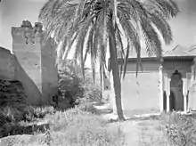 The eastern building of the necropolis is the older of the two main buildings in the necropolis. It is often referred to as the Qubba of Lalla Mas'uda (qubba being an Arabic word for a mausoleum, usually domed).[7][4][11] It consists of a small central square chamber (the so-called Chamber of Lalla Mas'uda), two rectangular loggia rooms on either side to the east and west, and a large rectangular chamber to the south (the so-called Grand Chamber) which connects directly to all three. In addition to the two loggias which open onto the gardens, there is an opening (a door or a former window) on the southern side of the large southern chamber. This unusual and almost symmetrical layout is believed to be the result of at least two different construction phases: a square mausoleum originally erected over the tomb of Muhammad al-Shaykh by Moulay Abdallah al-Ghalib and an expansion by Ahmad al-Mansur which added the other chambers around it (see history section above). The bulk of the building is built in brick.[4] The decoration, also believed to be from al-Mansur's time, is of high quality throughout, even though some scholars believe the decoration was left unfinished when Ahmad al-Mansur stopped working on this building and began constructing the western mausoleum.[7]