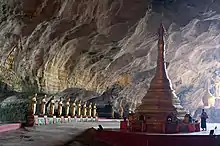 Saddan Cave is a major Buddhist cave temple with hundreds of small Buddha statues. It is located in the southernmost point of the Zwegabin Mountain range, Hpa-An, Kayin State, Myanmar. Saddan Cave is 107 meters long from east to west and 40 meters wide, and is the longest cave in Karen State with a narrow entrance. The cave is located at a height of about 30 feet from the ground and has a round shape. The cave is named after Saddan, the king of elephants who lived near the cave. The largest of the stalagmites is called the "Stone Pillar of the King of Elephants". The Saddan Cave Pagoda festival is held every year on the last day of Thingyan.[1][2] At the exit of Saddan Cave, there is a large lake, which is said to be King Saddan's bathing lake. Saddan Cave was a resting place for the legendary King Paarwana (ပအာဝနမင်းကြီး) when he was a hunter, according to Karen legend.[3]