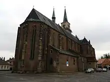 The temple is an example of brick Gothic architecture, except of a few parts which are made from sandstone. Its thin tower reaches 66 metres (217 ft) and together with mediaeval ramparts creates a characteristic silhouette of the town. The dean's church was initially dedicated to Saint Nicholas, during the Thirty Years' War the dedication changed to Saint Giles. The church is a cultural monument of the Czech Republic.