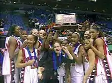 The 200708 girls basketball team storms the court in celebration of their class AAAA state championship.