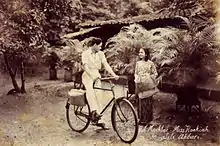 The story was adapted for the stage soon after publication, when it was performed by a group named Siti Akbari under Lie's leadership.[34] Lie also made a simplified version for a troupe of teenaged actors, whom he led in Bogor.[35] In 1922 the Sukabumi branch of the Shiong Tih Hui published another stage adaptation under the title Pembalesan Siti Akbari (Revenge of Siti Akbari); by 1926 it was being performed by Miss Riboet's Orion, a theatrical troupe led by Tio Tek Djien.[lower-alpha 7][36] The story remained popular well into the late 1930s. It likely inspired Joshua and Othniel Wong's 1940 film Siti Akbari, starring Roekiah and Rd. Mochtar. The extent of this influence is uncertain, and the film is likely lost.[37]