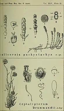 It grows as an erect or decumbent perennial herb with succulent, stem-like leaves, growing up to 0.8 m in height.[2] It is very similar to the better known beaded glasswort but is a larger plant and differs in having a thicker fruiting spike, 4โ9 mm in diameter, and seeds with blunt hairs or papillae.[3]