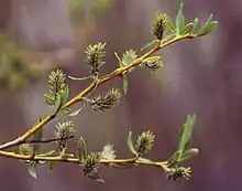 Salix lemmonii is a shrub growing 1 to 4 meters tall, sometimes forming colonial thickets. Its stems arise in a cluster and spread into many slender, angular branches. The leaves are up to 11 centimeters long, lance-shaped to oval with pointed tips, smooth or lightly serrated along the edges, and hairless and waxy or slightly hairy. The inflorescence is a stout catkin of flowers a few centimeters long, the female catkins lengthening to 6 or 7 centimeters as the fruits develop. This willow sometimes hybridizes with Salix geyeriana, to which it is closely related.[1]