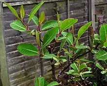 It is a deciduous shrub or small tree growing to 6 m (20 ft) tall. The leaves are alternate, 10โ25 cm long and 7โ12 cm broad, with an entire margin; they are green above, and glaucous below, with red veins and petiole. The flowers are produced in catkins in late spring after the new leaves appear; it is dioecious, with male and female catkins on separate plants. The male catkins are 10 cm long; the female catkins are 10 cm long at pollination, expanding to 25 cm long at seed maturity.[2][3]