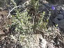 Salvia thymoides is an upright plant that reaches 1 foot (0.30 m) tall and wide, with grey-green 0.25 inches (0.64 cm) leaves that are evergreen and profusely cover the plant. The 0.5 inches (1.3 cm) flowers are purple-blue, and held in a tiny dark purple calyx, growing on whorls that are held on a short inflorescence that is 2 inches (5.1 cm) long.[1]